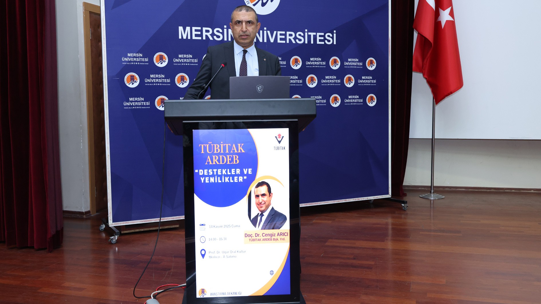 Konuşmaların ardından TÜBİTAK ARDEB Başkan Yardımcısı Doç. Dr. Cengiz Arıcı, ARDEB tanıtım sunumunu gerçekleştirdi. Sunumda ARDEB’in organizasyon yapısı, temel süreçleri, destek programları ile Türkiye ve Üniversitemiz özelindeki proje istatistikleri hakkında bilgiler verdi.
