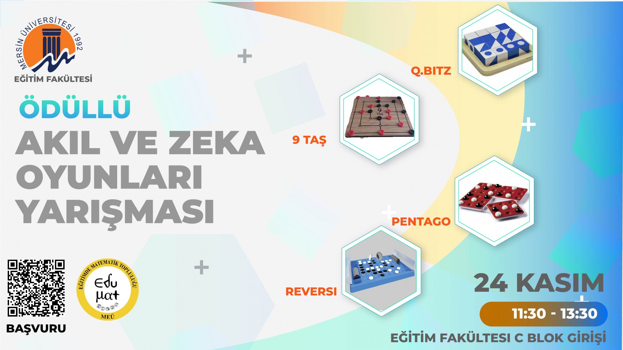 24 Kasım Öğretmenler Günü Etkinlikleri kapsamında EduMat (Eğitimde Matematik) Topluluğu tarafından "Ödüllü Akıl ve Zeka Oyunları Yarışması" düzenlenecektir. Yarışmada Akıl ve Zeka Oyunlarından 9 Taş, Q.bitz, Reversi ve Pentago oyunları yer almaktadır. Yarışmaya katılmak isteyenler 21.11.2025 tarihine kadar ekli formu doldurarak başvurmaları gerekmektedir.