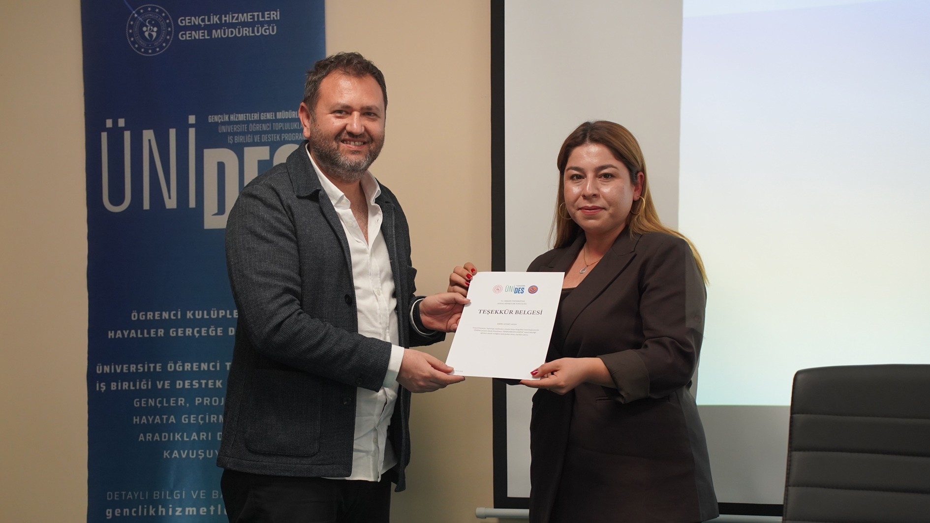 İkinci oturum, Sosyal Hizmet Uzmanı Kasım Kırmızı’nın işitme engeli tanımı, türleri, işitme engeli konusunda doğru bilinen yanlışlar ve işitme engelli bireylerle iletişim konusundaki sunumuyla devam etti. Sahadaki deneyimlerini de paylaşan Kırmızı, engelli bireylerle iletişimde empati ve saygının önemine vurgu yaptı. Oturumun ikinci kısmında Kırmızı’ya, Sosyal Hizmet ve Danışmanlık Bölümü 1. sınıf öğrencisi Elif Nur Geran moderatör olarak eşlik etti. Kendi kardeşinin de işitme engelli bir birey olduğunu ifade eden Geran, engelli bireylerle kurduğumuz iletişim kadar, onların bizlerle kuramadıkları iletişim ve kendilerini doğru ifade edememelerinin yol açtığı öfke ve stres üzerine değerlendirmelerde bulundu. Katılımcıların sorularının yanıtlanmasının ardından, Topluluk Danışmanı Öğr. Gör. Dr. Gülten Acar tarafından Kasım Kırmızı’ya teşekkür belgesi takdim edilmesiyle ikinci oturum tamamlandı.