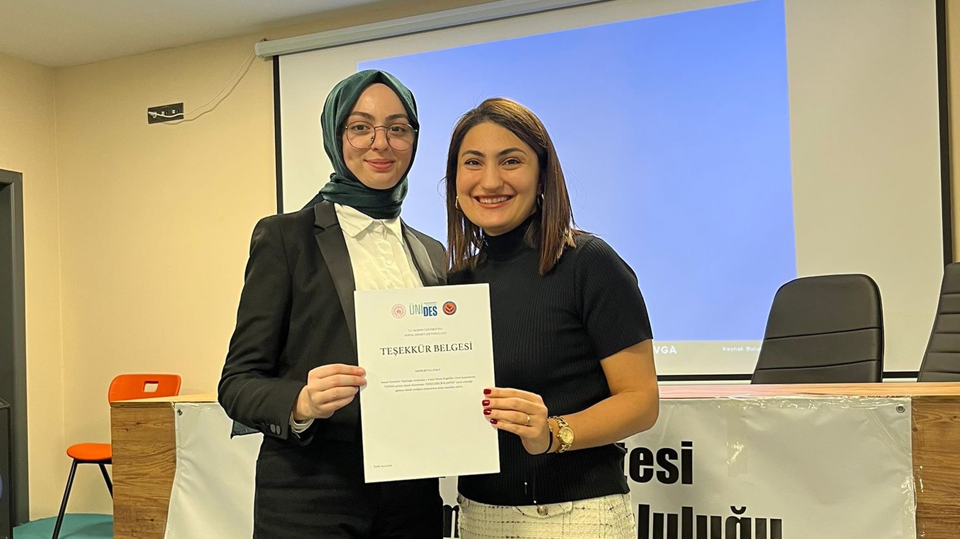 Üçüncü oturum, Sosyal Hizmet Uzmanı Beyza Aybat’ın bedensel engellilik tanımı ve türleri üzerine yaptığı sunumla başladı. Aybat, sunumunda engelli bireylerin yaşadığı ayrımcılığa değinerek sahadaki deneyimlerinden örnekler verdi ve toplumda doğru olduğu sanılan bazı yanlış uygulamalara dikkat çekti. Oturumun ikinci kısmında Aybat’a, Sosyal Hizmet ve Danışmanlık Bölümü 1. sınıf öğrencisi İlknur Yasan ile moderatör Berfin Karadaş eşlik etti. Bedensel engeli bulunan Yasan, engelinin ortaya çıkış sürecini paylaşarak bedensel engellilik durumunda fizik tedavinin olumlu etkilerinden, eğitim hayatında karşılaştığı güçlüklerden ve kendisini üzen, kırıcı yaklaşımlardan söz edip, kampüsün engelli öğrenciler için uygunluk durumunu değerlendirdi. Katılımcıların sorularının ardından üçüncü oturum, Beyza Aybat’a Sağlık Hizmetleri Meslek Yüksekokulu Müdür Yardımcısı Öğr. Gör. Dr. Yasemin Salkın tarafından teşekkür belgesi takdim edilmesiyle sona erdi.