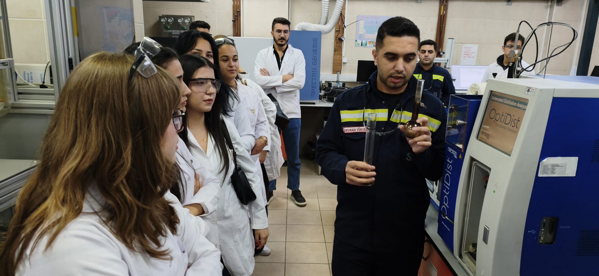 Bölümün mezun öğrencisi Kaan GÜLBURNU’nun Laboratuvar sorumluluğunu yürüttüğü SGS’ de çalışan diğer bölüm mezun öğrencilerimiz Devran YÜKSEL, Mehmet ARSLANKILIÇ, Öznur YERLİKAYA ve Buket METE eşliğinde Laboratuvarda yürütülen faaliyetler ve analizler hakkında bilgiler verilerek, çeşitli yakıt analizleri öğrencilerimiz ile birlikte uygulamalı olarak gerçekleştirildi.